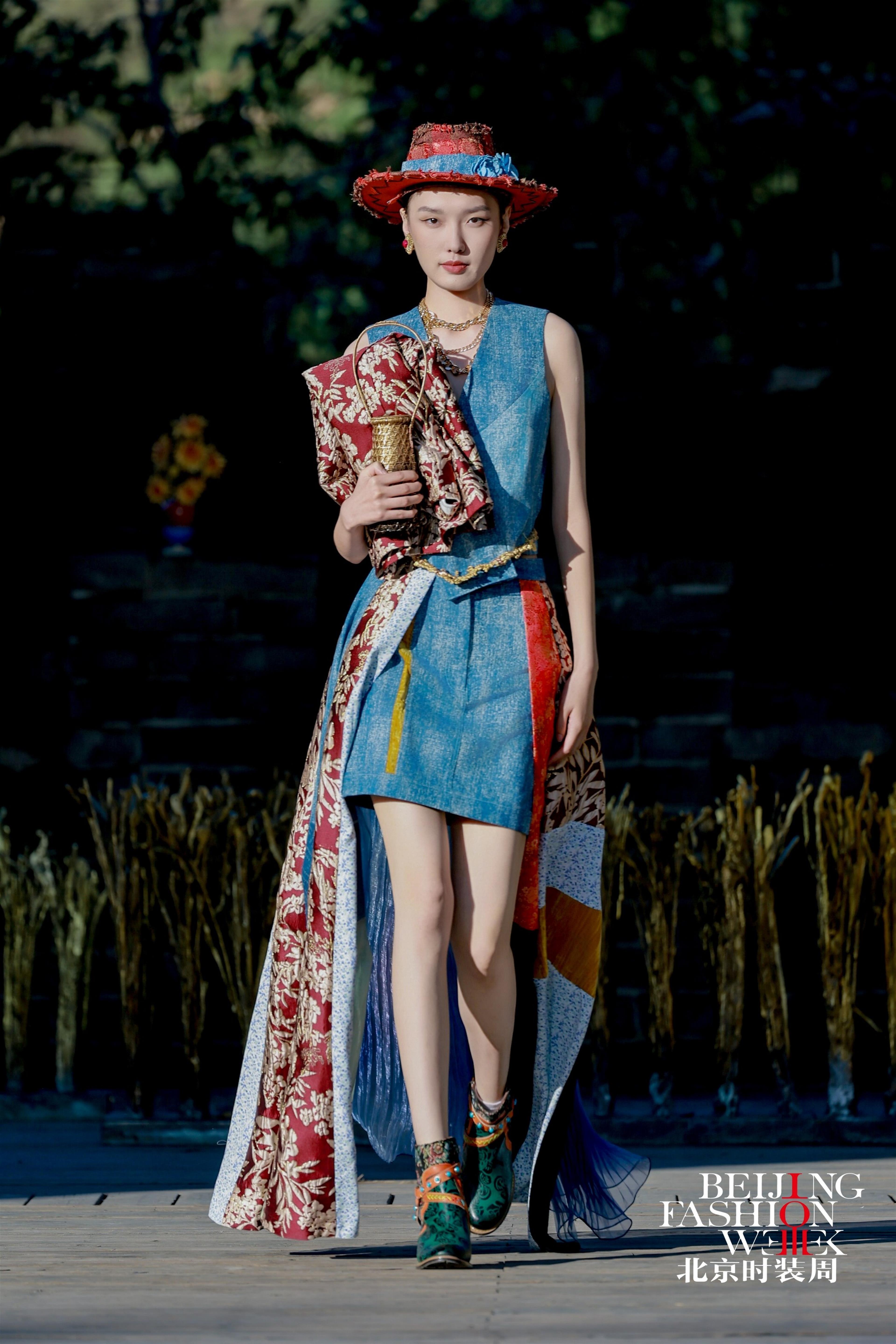 大秀以长城为天然幕布,模特们身着以匠人工装为原型重新解构的作品依次登场:工装立体袋、撞色走线与面料拼接的设计,精准模拟工装的补丁特点,既是对传统工装的致敬,也是一次创新。礼帽、臂环、手袋等配饰则用铜丝金属精心打造,透出刚柔并济的独特质感。 “艺术跨界有它强大的生命力”,朱炳仁坦言。他因承建杭州雷峰塔、峨眉山金顶等百座铜建筑项目,被誉为“中国铜建筑之父”。2006年,他首创熔铜艺术,为铜艺创作开辟自由新境界。一直以来,他还在书法、绘画、篆刻、诗歌等领域持续探索跨界。去年,他与REDMOON CHEN联合推出的“云墨熔装”亮相米兰时装周,此次“匠师熔装”为北京时装周闭幕式画上完美句号。 作为全国五一劳动奖章获得者,朱炳仁首次将匠人美学融入服装设计。他带来的砺本牛仔、匠构西装、熔彩织锦三大系列共50余套服装,以三幕式结构完整讲述了关于“匠心”的动人叙事。朱炳仁表示,这场专为劳动者创作的工匠之秀,是献给中国和世界所有劳动者的礼物。 秀场选址在雄伟壮丽的司马台长城,为大秀赋予了深刻文化内涵。时尚编导、秀导王红民介绍,秀场依托长城文化构建特色场景,秀中作品融入石马、射箭等游牧民族文化符号,彰显多元文化的共生共融。 大秀以“熔”为核心理念,含“包容”之意。在秀场现场,朱炳仁的《燃烧的向日葵·国葵》《庚彩水果系列》《稻可道,非常稻》等经典熔铜作品同步亮相。“国葵”寓意代代向好,巨型“庚彩水果”象征秋日收获,吸引观众纷纷打卡拍照。走秀环节中,模特手持向日葵种子播种于土壤,与向日葵作品呼应,隐喻艺术的传承与绽放。 朱炳仁说:“我希望通过这些作品,打破‘工装=廉价’‘时装=疏离’的偏见,让工艺回归灵魂,让设计承载人文,让时装成为连接历史、当下与未来的桥梁。”这场“匠师熔装”大秀,为北京时装周十周年写下浓墨重彩的一笔。